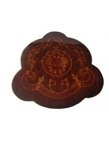 Περίτεχνο ξύλινο τραπεζάκι με εμπλεκόμενα μασίφ πόδια και ένα μικρό συρτάρι. Ξύλινη μαρκετερή στο άνω μέρος του. Διαστάσεις: ύψος 74 εκ, πλάτος 45 εκ